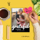 Design features a modern black and white color block script for the word grateful.