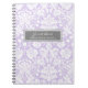 Carnet en spirale de livre d'invité de mariage dans le motif vintage en pastel léger élégant de damassé florale classique de pourpre de lavande, grise et blanche. Personnalisable avec vos noms et date de mariage.