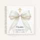 Mark her Confirmation day with this elegant personalized guest book featuring a luxurious ivory bow with pearl details and a delicate gold cross on a crisp white background.