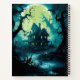 Des arbres morts et sans feuilles se dirigent vers un chemin de terre menant à une maison hantée déplaisante. Un brouillard turquoise entoure le chemin et une grande lune verte se lève derrière la maison. C'est une oeuvre d'art amusante pour les amateurs d'Halloween et d'horreur.