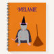Ce carnet en spirale impressionne par l'image art numérique d'une mignonne sorcière de rat gris aux oreilles roses, au nez, aux pieds et à la queue. Le rat porte un casquette pointu noir avec une boucle d'or et des étoiles violettes tout autour. Les rats portent aussi un manteau noir couvert d'étoiles violettes. A côté du rat, un balai brun fait de brindilles. Ce rat est habillé prêt pour une fête d'Halloween. Il y a du texte personnalisé pour que vous puissiez inclure un nom.