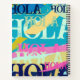 Hola texte répété dans une palette colorée de bleu, jaune, rose, turquoise et vert.
