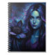 Portrait mystique bleu-violet d'une femme lumineuse tenant une grande fleur sauvage sombre, lueur éthérée, reflets néon et atmosphère de fantaisie rêveuse.