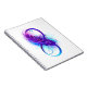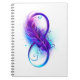 Infinity symbole with a beautiful feather painted in purple and blue bright colors on white background
