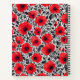Un patrón de flores rojas con hojas y tallos negros sobre un fondo blanco, creando un diseño gráfico y dinámico.