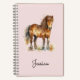 Joli cahier pour enfants en rose clair avec un dessin aquarelle d'un joli cheval brun et un nom personnalisé en écriture fantaisiste.