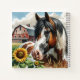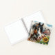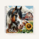 Joli cahier personnalisé avec un cheval brun, noir et blanc tacheté entouré de tournesols et d'une grange rouge rustique en arrière-plan.