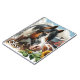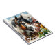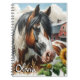 Joli cahier personnalisé avec un cheval brun, noir et blanc tacheté entouré de tournesols et d'une grange rouge rustique en arrière-plan.