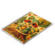 Une illustration charmante d'un raton laveur aux yeux écarquillés tenant un gland, assis sur une souche d'arbre au milieu d'une forêt automnale colorée. Entourée de feuilles d'automne vibrantes, de champignons et d'arbres persistants, cette scène ludique de la forêt évoque une atmosphère cosy et nostalgique. Le style texturé et pictural lui donne une chaleur artisanale et semblable à un livre de contes.