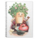 Antique postcard illustration from the 1900's, with a smiling face, rosy cheeks, humanized potted plant of four leaf clover shamrocks, surrounded by a red tampy heart and key, and a pretty golden yellow butterfly. Much good luck !