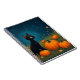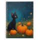Dans un champ au clair de lune, un chaton noir ludique tisse à travers des citrouilles vibrants, dont les teintes orange brillent doucement. Ci-dessus, un ciel sombre scintille de formes d'étoiles fantaisistes, créant une scène nocturne magique.