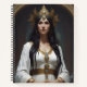La diosa resplandece con elegancia y poder, vestida de blanco y dorado, con su largo cabello negro fluyendo como la noche, coronada con una elaborada diadema que brilla con intensidad.
