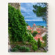 Vue sur la petite ville Omis entourée de montagnes, rivière Cetina et mer, Riviera Makarska, Croatie. Vue sur le pin, le vieux centre ville avec toits rouges et bleu voir.
