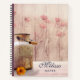 Un carnet en spirale à la décoration campagnarde. Un vieux lait rouillé peut avec une jolie fleur d'orange. Blé et pavots rouges estampillés dans l'arrière - plan dressés contre un panneau en bois.