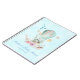 Un carnet en spirale avec une charmante illustration d'un bébé lapin qui roule le long d'une montgolfière décorée de coeurs, d'un ruban, de fleurs et de papillons.