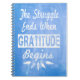 Le journal bleu affligé de gratitude qui énonce dans le lettrage blanc, "la lutte finit quand la gratitude commence"