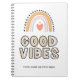 Un design heureux et amusant avec le texte "Good Vibes" dans de belles lettres boho avec un arc-en-ciel coloré.