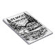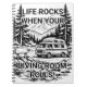 This black-and-white illustrated design features a classic camper van parked in a serene forest campsite, surrounded by tall pine trees, mountains, and a flowing stream. Bold typography reads “Life Rocks When Your Living Room Rolls!”, celebrating van life, RV travel, and the freedom of the open road. Rendered in a vintage woodcut-style illustration, this design is perfect for campers, travelers, digital nomads, and outdoor adventure lovers who enjoy journaling, planning trips, or taking notes on the go.