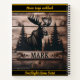 Un orignal joliment ouvragé apparaît sur un décor de bois rustique, encadré de silhouettes de pins, créant un spectacle époustouflant qui met en valeur la beauté et l'artisanat de la nature. REMARQUE Pour modifier des couleurs de texte ou de bordure, utilisez l'outil Modifier à l'aide de la conception