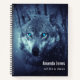 Un carnet en spirale personnalisé avec l'image d'un loup mystique magique debout dans une forêt avec une légère chute de neige. C'est des yeux bleus qui attirent vraiment votre attention.