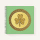 Ce magnifique carnet en spirale présente une image graphique d'une pièce d'or avec deux nuances d'or. Le cercle extérieur a une texture rugueuse. À l'intérieur du cercle intérieur de la pièce se trouve un shamrock doré texturé composé de 3 feuilles et d'une tige.
