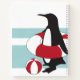 Un manchot se tient debout avec une chambre à air rouge et blanc et un ballon de plage sur un fond bleu clair et blanc. Cet animal de dessin animé joli avec un texte personnalisé fait un cahier mignon et unique.