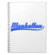 Manhattan, New York City, écrit avec un swash (queue). Polices en blanc et bleu. Conception de texte originale.