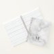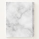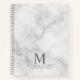 Carnet professionnel avec monogramme personnalisé, nom et texte en gris dans un style de police serif classique sur fond de marbre blanc.