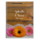 Le Carnet Spiral de Mariage campagnard Rustic Daisy Trio peut être personnalisé avec les noms de la mariée et du marié et leur date de cérémonie de mariage de la grange pour créer un livre d'invité personnalisé, un livre de conseils ou un endroit pour garder votre mariage planification de faire la liste. Il présente une photo florale pittoresque de deux marguerites roses et d'une fleur de marguerite orangée et un voile de mariée blanc avec un arrière - plan de grange patiné brun. Idéal pour une fête décontractée à la ferme ou au ranch.