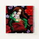 Une femme aux cheveux auburn tenant un masque de mascarade vénitienne portant rouge et vert sur fond de noir avec des fleurs rouges et violettes