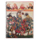 Colorful expressive antique fine art. Medieval heraldic German miniature from 1200 fighting knights with dames, old aged brown parchment effects