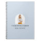 Sleek and minimal baby blue real estate notebook design featuring a professional arched photo frame and clean typography. Ideal for realtors, brokers, and real estate professionals to keep notes, client details, and property listings organized. This elegant design adds a personal, branded touch — perfect as office stationery, client gifts, or team branding. Fully customizable with your own photo, name, and business details.