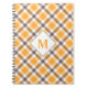 This modern spiral notebook features a colorful tartan (plaid) pattern in orange, grey and white with a customizable orange monogram.