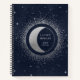 Carnet spiral avec une lune argentée et étoiles design sur un arrière - plan bleu nuit foncé. Texte entièrement personnalisable dans une couleur correspondante. Consultez notre magasin pour plus d'articles de notre collection "Argent céleste" ou pour des options de carnet en spirale plus personnalisées.