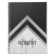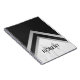 Ce carnet moderne présente un design géométrique avec un nom personnalisable et un monogramme dans un cadre en marbre blanc et argent sur arrière - plan noir.
