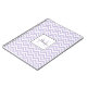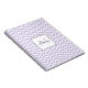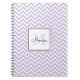 Le carnet spiral personnalisé est doté d'un motif chevron lavande tendance avec un nom personnalisé en police d'écriture noire et monogramme en couleur lavande assortie dans cadre carré blanc.