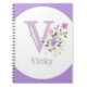 La conception présente le monogramme et le nom du destinataire avec des fleurs de chaque côté dans un style pastel à l'aquarelle. L'initiale est la lettre V.