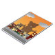 Un ours brun monstre en colère détruit une ville et des bâtiments au lever du soleil sur ce carnet inspiré par l'imaginaire cool