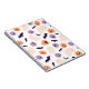 Ce design présente un motif d'Halloween ludique et coloré avec un design minimaliste. Le motif comprend des formes simples et arrondies de citrouilles, de fantômes, de crânes et de chauves-souris, tous dispersés sur un fond blanc. La palette de couleurs est douce mais vibrante, avec des citrouilles dans des nuances d'orange, des fantômes en pêche pâle, des crânes en lavande et des chauves-souris en violet foncé. Chaque élément a une expression mignonne et amicale, ce qui rend le motif amusant et léger, parfait pour les décorations d'Halloween ou les thèmes de fêtes pour enfants. Le design général est joyeux et festif, capturant le côté fantaisiste d'Halloween.