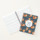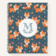 Un carnet personnalisé avec un motif fait de renards orange mignons et heureux. Arrière - plan vert foncé. Petits champignons et feuilles parsemés. Un cercle blanc superposé avec votre nom et votre monogramme initial à l'intérieur.