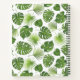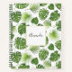 Un carnet en spirale personnalisé avec un joli motif composé de feuilles tropicaux verts. Design exotique et élégant. Un carré blanc avec une fausse bordure en feuille d'or superposée avec votre texte à l'intérieur.