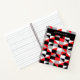 Ce carnet en spirale présente un motif géométrique coloré avec des polygones rouges, noirs, blancs et gris. Personnalisez-le avec votre nom dans une simple police blanche placée en haut.