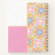 Le design motif des fleurs roses et bleues de l'artiste est sur le côté du carnet, de l'avant et de l'arrière. De l'autre, un carré blanc et rose avec une ligne jaune au milieu. Et les textes peuvent être personnalisés par le client.