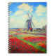 Carnet avec la peinture de la fleur et du moulin de Claude Monet. De beaux champs colorés de tulipes rouges, roses et jaunes à côté d'un moulin et d'une maison en Hollande. Un grand cadeau Monet pour les amateurs d'impressionnisme et d'art français.