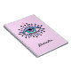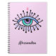 A Mystical All-Seeing Eye in shades of Teal Pink Lavender Blue on a light pink notebook. Bursting with eyelashes that look like rays of light! Personalize it!