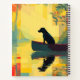 A black Labrador sitting peacefully in a canoe, surrounded by a warm, glowing landscape.