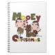 Deux vaches dans des casquettes de bas, des cadeaux de Noël, des lumières de vacances, des sucres de canne, et texte rouges qui lit "Noël de Mooey" sur le T-shirts de vacances, les tasses, les cartes, les autocollants, les sacs fourre-tout, les horloges murales, les boîtes de souvenir, les ornements, les porte - clés, et d'autres habillement et cadeaux mignons de vacances de thème de vache.