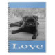 Ce cahier canin amusant présente une image en noir et blanc d'un chiot de chien carlin noir posé sur un porche en bois Une bordure bleue a mis en évidence la photo et le mot amour dans une police blanche contrastée.