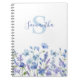 Carnet floral fleur sauvage d'aquarelle bleu avec monogramme et nom. Pour l'école ou le bureau. Facile à modifier le texte.