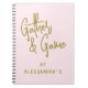 Carnet stationnaire personnalisé avec le nom de l'hôte par exemple. Feminine, élégant, élégant, élégant, joli, aspect girly. Design minimaliste simple avec une phrase personnalisable et amusante disant "Gather & Game" et le nom personnalisé. Un petit carnet pour garder la trace des jeux et des points de sport score à un rassemblement amusant en famille ou entre amis, à un jeu de carte, un tournoi de jeu de fléchettes, match de sport trou de maïs par un jeu de pickleball sport. Aspect haut de gamme, arrière - plan rose pastel neutre, écriture dorée tendance calligraphie manuscrite et typographie de police sans serif moderne et propre. Les joueurs sont amusants et relaxants, une véritable forme d'autosoin dans la vie stressante que nous avons. Pour vos dates d'hébergement ou comme un cadeau réfléchi pour un grand hôte. Un cadeau sur mesure créatif de moins de 15 dollars pour elle.
